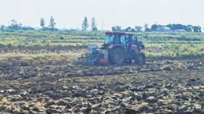 农机来回穿梭平整土地。
