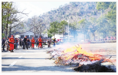 作者: 特约记者杨金华 摄 来源:孝感日报 字数:134 11月21日,在防火演练现场,防火队员在灭火。针对当前森林防火的严峻形势,双峰山举办了一场森林防火应急实战模拟演练活动,通过模拟森林局部火情场景,展示了无人机空中指挥,防火队员用背负式、手提式风力灭火机、消防车现场灭火的协同运用。■特约记者杨金华摄