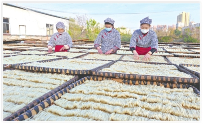 作者: 全媒体记者闵丽萍 特约记者陈保忠 来源:孝感日报 字数:158 11月26日,云梦县城关镇黄湖社区,黄湖吴家鱼面厂晾晒场上,工人正忙着晾晒鱼面。作为百年非遗美食,云梦鱼面以鲜鱼茸与面粉制成,色白如丝,是地理标志保护产品。今年以来,随着云梦文旅融合升温,非遗鱼面成游客热购特产。眼下各厂家抢抓晴好天气抓生产,备战元旦、春节市场。全媒体记者闵丽萍特约记者陈保忠摄