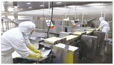 在生产线的末端,经过核检、贴标的产品被迅速装箱、封装。机械臂有条不紊地将一箱箱产品码放整齐,经传送带运至仓储,即将销往全国各地以及欧洲、东南亚等海外市场。