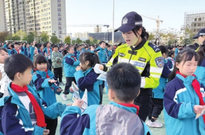 作者: 通讯员李凡 程静怡 摄 来源:孝感日报 字数:120 11月27日,在第十四个“全国交通安全日”到来之际,孝感市公安交通管理局直属二大队民警走进市高新区实验小学,开展了一场别开生面的“文明交通礼行天下”主题宣传活动。该校1800余名师生参与活动。(通讯员李凡程静怡摄)