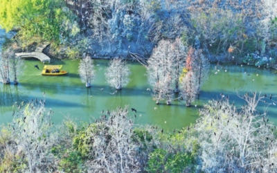作者: 全媒体记者徐文 摄 来源:孝感日报 字数:147 12月13日,孝感朱湖国家湿地公园鸬鹚、小天鹅、斑嘴鸭等万只候鸟聚集,与湿地冬景构成绝美画面,游客泛舟湿地美不胜收。近年来,朱湖持续推进生态保育与修复,为候鸟营造优良越冬环境,成为湖北省最佳观鸟地之一。不少游客和摄影爱好者前来,用镜头捕捉人与自然和谐共生的美好瞬间。■全媒体记者徐文摄